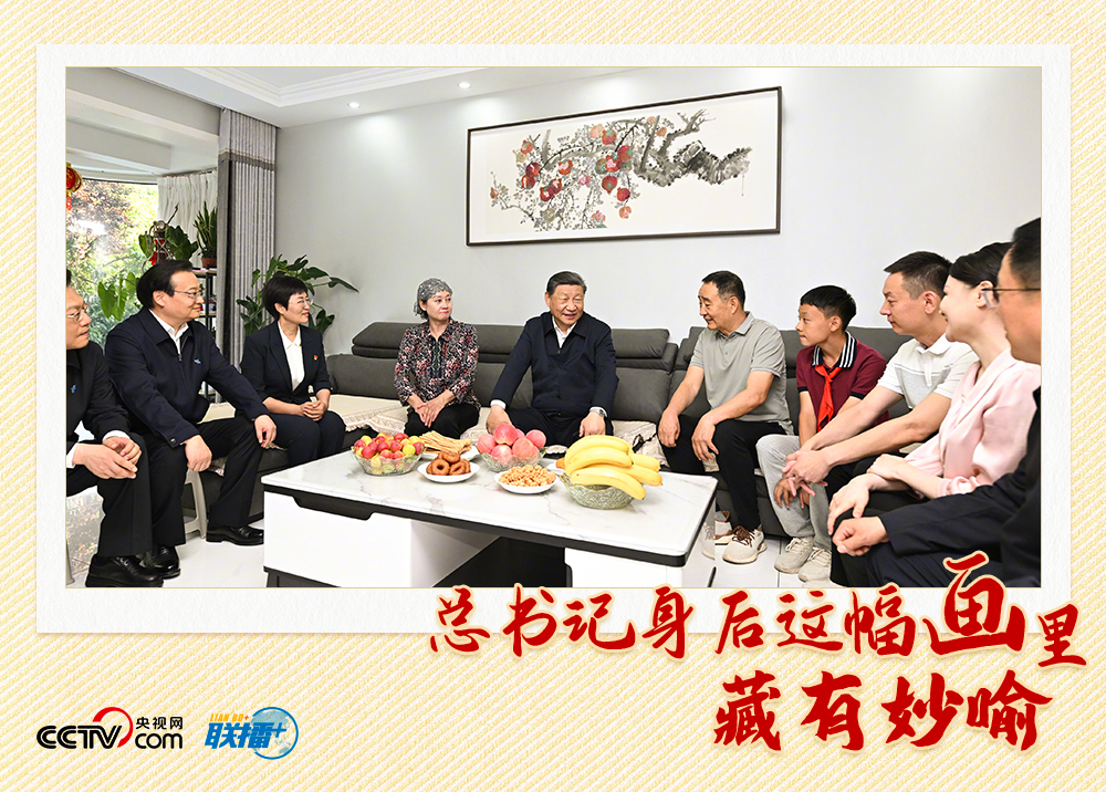 聯(lián)播+6月19日下午,習(xí)近平總書記來到寧夏銀川市金鳳區(qū)長城花園社區(qū)考察。在總書記看望的社區(qū)居民趙守成家里,客廳墻上掛著的一幅水墨畫格外顯眼。畫中,火紅的石榴結(jié)滿枝頭,呈現(xiàn)出一幅豐收景象。