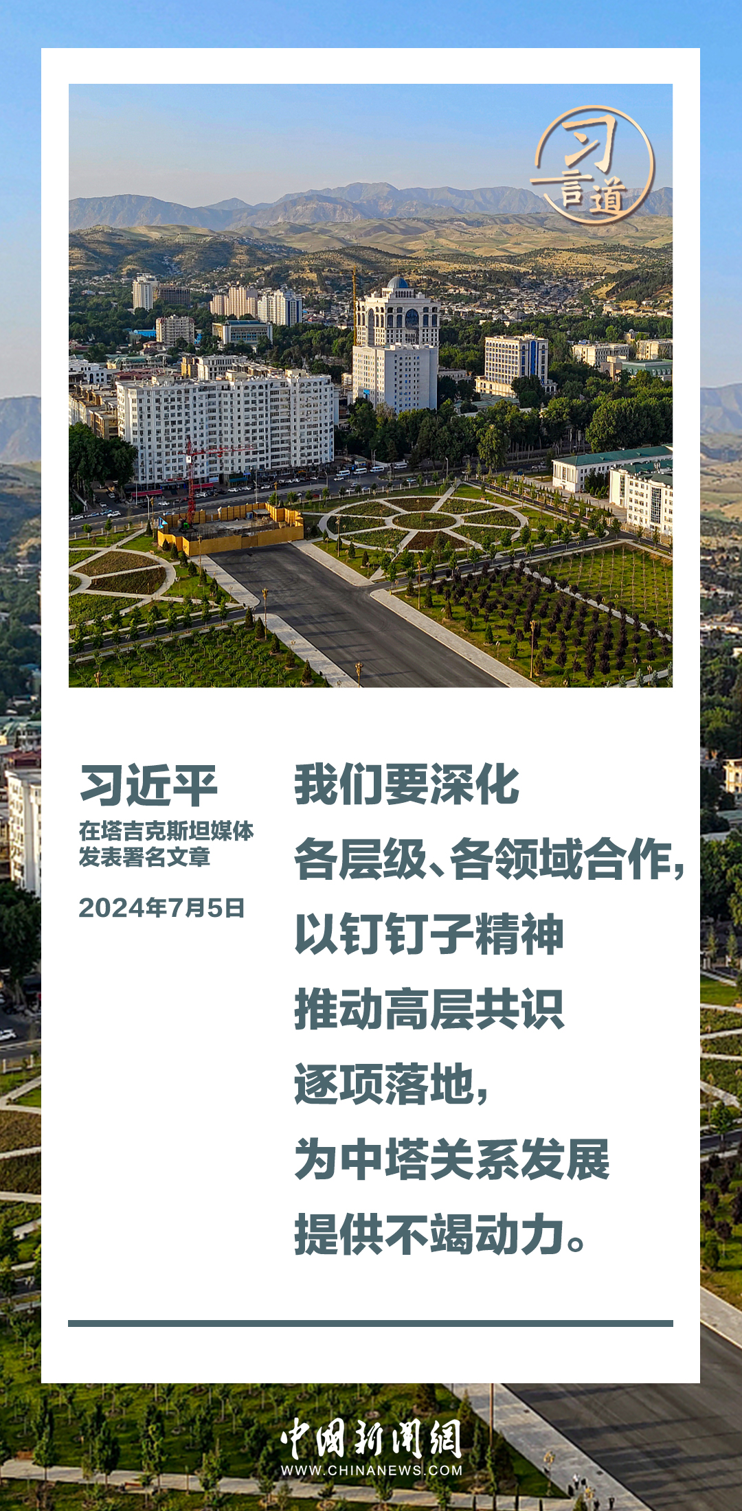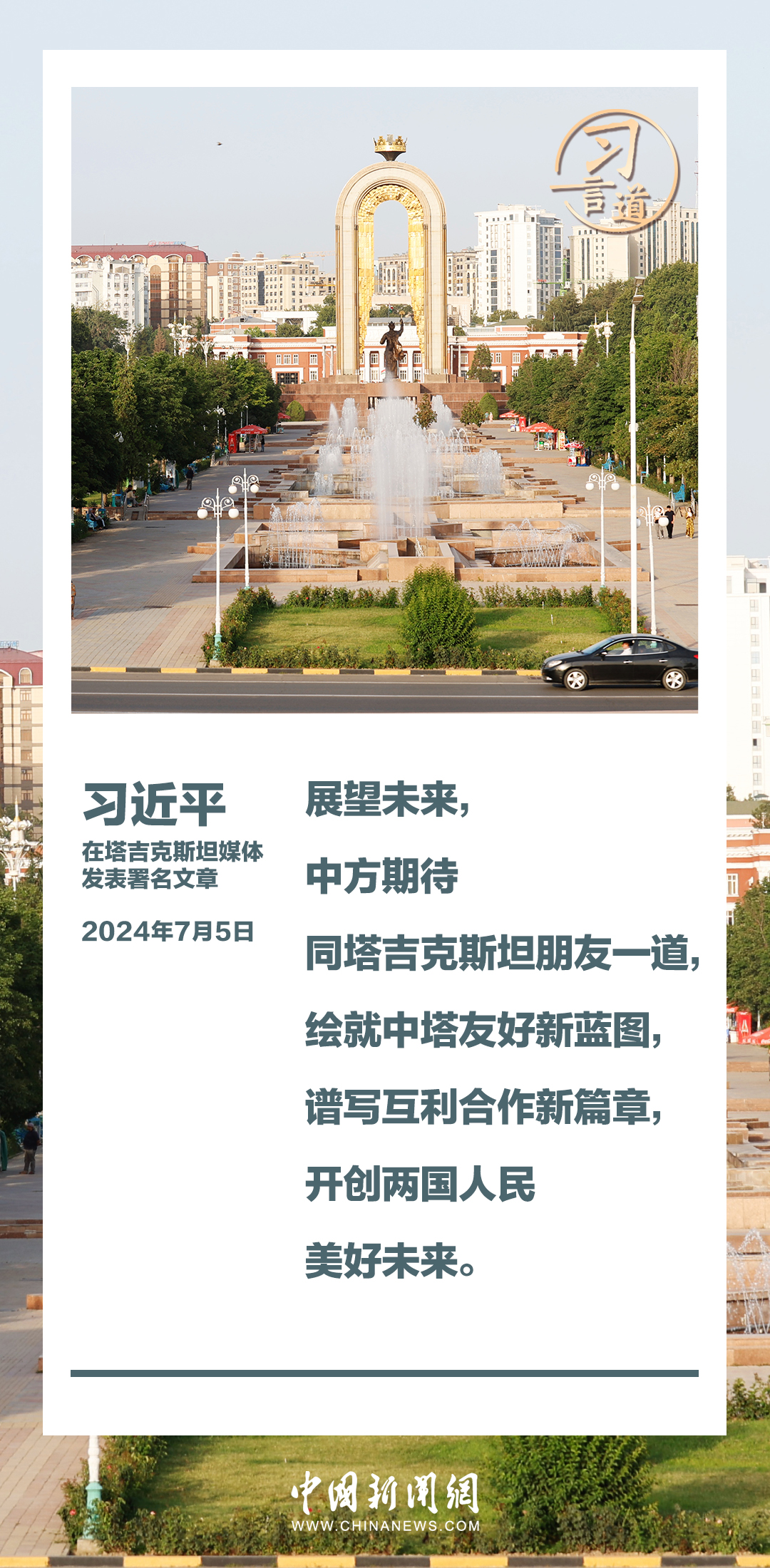 7月5日,在對塔吉克斯坦進行國事訪問之際,國家主席習近平在塔吉克斯坦《人民報》和“霍瓦爾”國家通訊社發(fā)表題為《共創(chuàng)中塔關系美好明天》的署名文章。習近平指出——