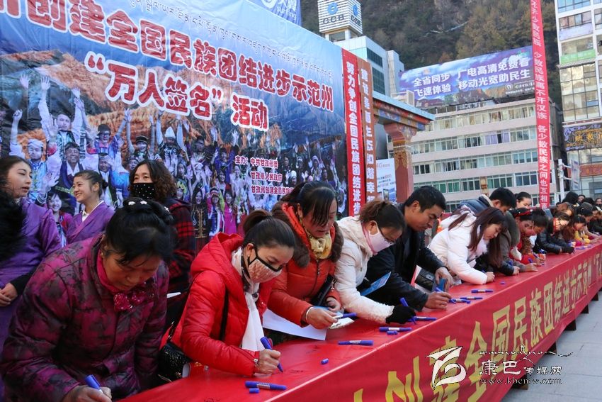 州人大常委會(huì)副主任李致民宣布創(chuàng)建全國(guó)民族團(tuán)結(jié)進(jìn)步示范州“萬人簽名”活動(dòng)正式開始后,州領(lǐng)導(dǎo)汪洋、李致民、楊國(guó)元、范文華、蔣秀英、楊學(xué)康以及甘孜軍分區(qū)、駐州武警部隊(duì)領(lǐng)導(dǎo)同州級(jí)機(jī)關(guān)、志愿者、個(gè)體工商戶、學(xué)生、駐軍、政法干警、康定縣黨政機(jī)關(guān)干部代表近千人,陸續(xù)到“萬人簽名”條幅上簽下了自己的姓名。