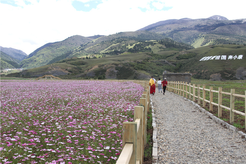 去年,在我州理塘縣濯桑鄉(xiāng)漢戈村, 當地爭取各方資金,利用旅游區(qū)位優(yōu)勢和老百姓群策群力,打造了占地800多畝、以波斯菊為主的漢戈花海,配套修建了賽馬場、游客中心、鍋莊廣場等。從去年國慶開始,漢戈花村開門迎客,鮮花留住了游客,也留住了收入。