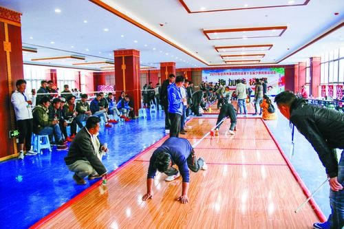 今年,我州將由115名運(yùn)動(dòng)員、教練員等組成11支運(yùn)動(dòng)隊(duì),參與賽事設(shè)置的8個(gè)競賽項(xiàng)目和2個(gè)表演項(xiàng)目,其中有兩支隊(duì)伍將參與綜合類表演項(xiàng)目比賽。我州總參賽人數(shù)相比上一屆略有減少。我州參加綜合類表演項(xiàng)目比賽的節(jié)目是《瑪亞切通》和《炯動(dòng)》?!冬攣喦型ā纷g為孔雀吃水,主要體現(xiàn)力量和平衡的動(dòng)作;《炯動(dòng)》取材于藏民族農(nóng)村修建房屋時(shí)的勞動(dòng)場面,以青年男女在勞動(dòng)過程中載歌載舞對(duì)歌或比拼勞動(dòng)成果、質(zhì)量、進(jìn)度為內(nèi)容,主要比拼身體的力量和靈活度。我州參加競技類表演項(xiàng)目比賽的節(jié)目是《嘎久》?!陡戮谩芬鉃榉嗰R鞍或吉祥翻越,是藏族人民節(jié)日聚會(huì)時(shí)的一種競技體育活動(dòng),主要比拼靈活性、趣味性和技巧性。