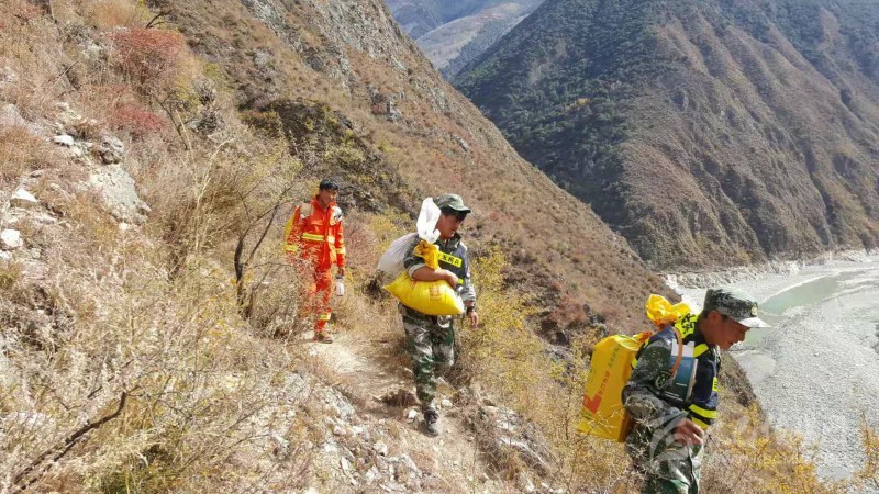 車輛無法前行,白玉縣民兵以及相關應急隊伍將救災物資順著小路背上現(xiàn)場