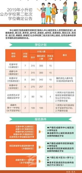6月17日,記者從成都市教育局獲悉,根據(jù)《成都市教育局關(guān)于2019年小學(xué)畢業(yè)生初中入學(xué)工作的通知》(成教函〔2019〕35號)規(guī)定,中心城區(qū)(包括成都天府新區(qū)[指納入中心城區(qū)招生入學(xué)范圍的區(qū)域]、成都高新區(qū)、錦江區(qū)、青羊區(qū)、金牛區(qū)、武侯區(qū)、成華區(qū)、龍泉驛區(qū)、青白江區(qū)、雙流區(qū)、溫江區(qū)、郫都區(qū)、新都區(qū))公辦學(xué)校第二批次(詳見學(xué)位計(jì)劃表)實(shí)行網(wǎng)上報名、在符合條件的學(xué)生中隨機(jī)派位錄取的辦法。網(wǎng)上申報時間為6月22日10:00至25日17:00;7月2日16:00,成都市招考辦將在服務(wù)平臺上載入派位結(jié)果,學(xué)校公布錄取學(xué)生名單。