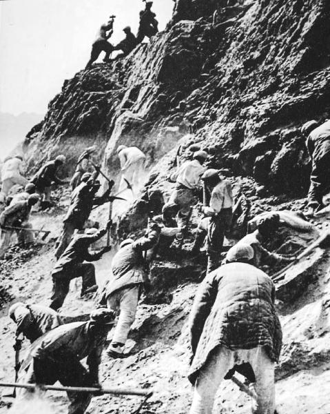 當年川藏公路建設現(xiàn)場。(翻拍自二郎山隧道展板)