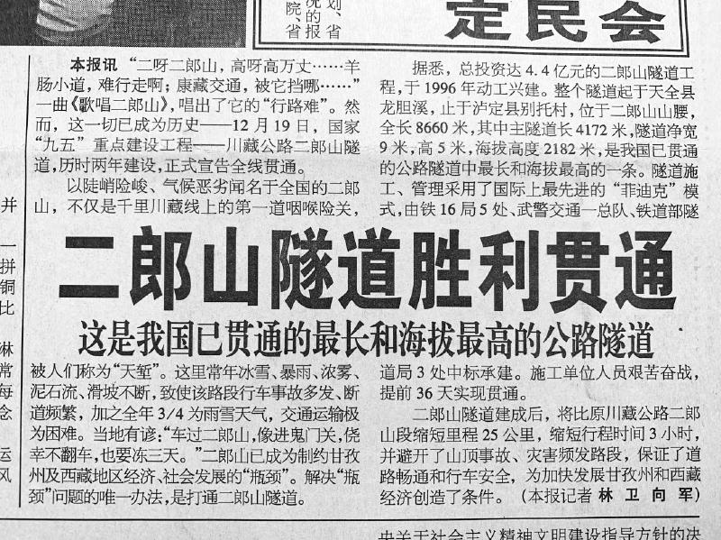 二郎山老路交通瓶頸,影響到甘孜州及西藏地區(qū)經(jīng)濟社會發(fā)展。1996年,二郎山隧道開建,歷時2年,于1998年底貫通。“二郎山隧道當時是全國最長、海拔最高、地質(zhì)最復雜的公路隧道,建設很不容易?!绷中l(wèi)回憶,當年采訪建設二郎山隧道的鐵道部隧道局三處和武警交通一總隊時,曾聽聞隧道開挖中遇到的各種危險,一名現(xiàn)場指揮長就曾被卷入洪水,所幸后來死里逃生。
