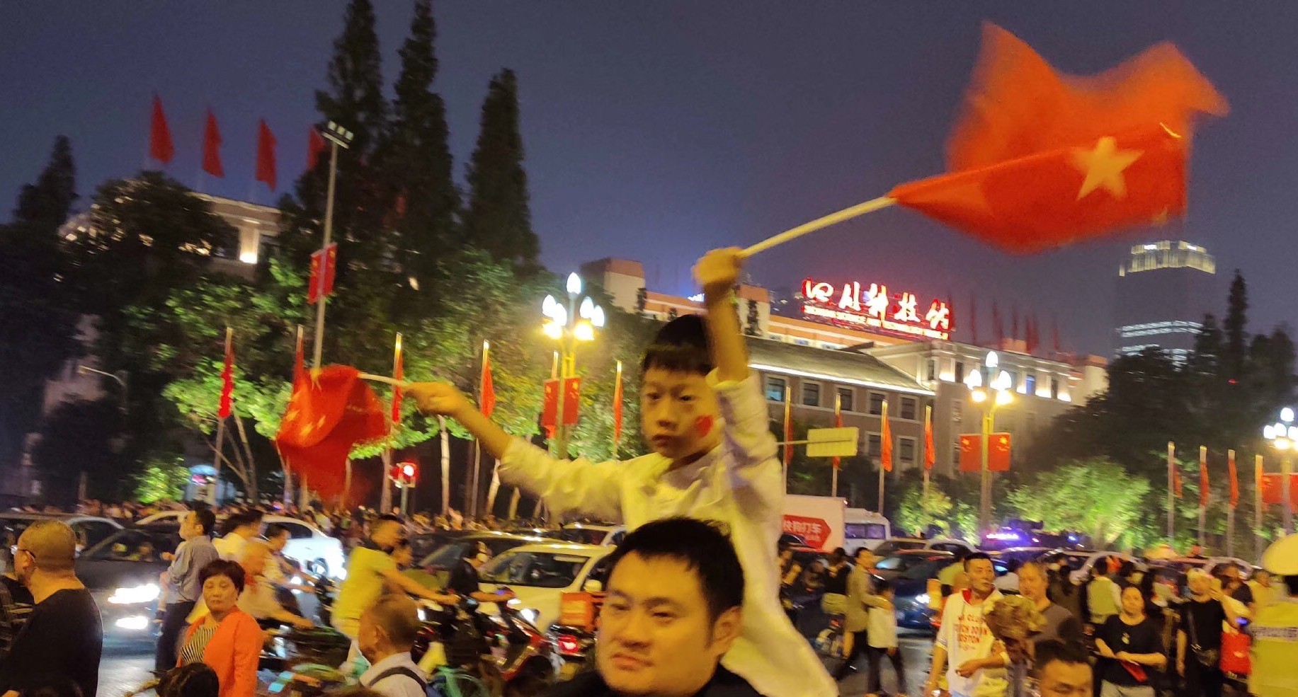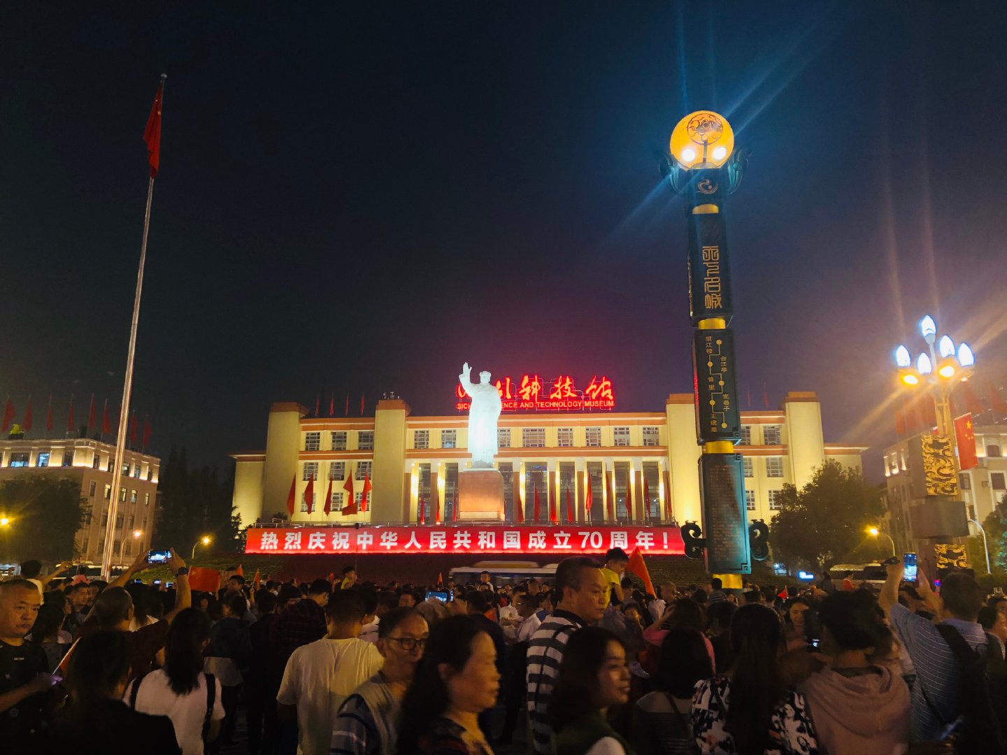 為慶祝新中國(guó)成立70周年,成都市開(kāi)啟超級(jí)夜景模式。四川大劇院、四川美術(shù)館、四川省圖書(shū)館、成都市博物院等建筑被大型投影包裹,美輪美奐!群眾紛紛拍照留念,還有群眾激動(dòng)地在現(xiàn)場(chǎng)合唱《我和我的祖國(guó)》,祝福祖國(guó)母親生日快樂(lè)。