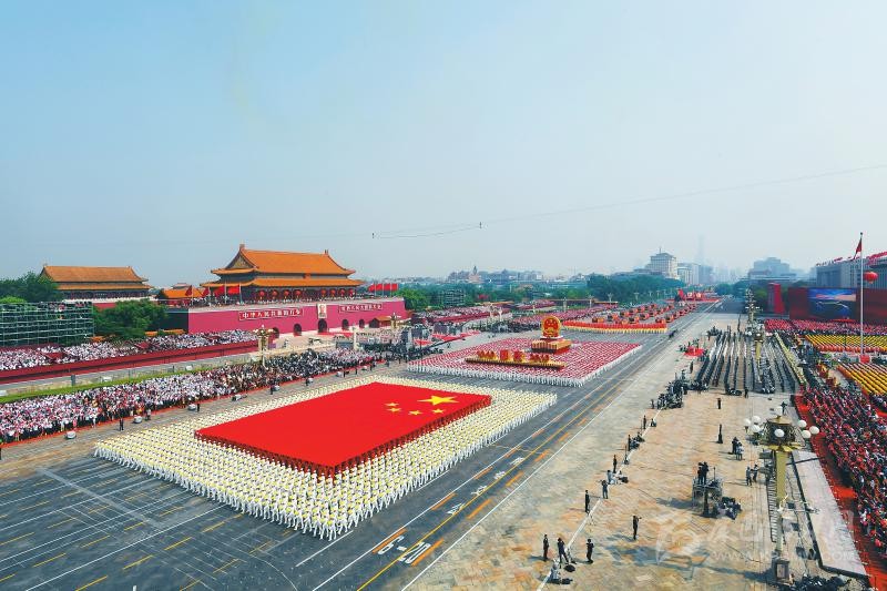 金秋時節(jié)的北京,張燈結(jié)彩,繁花似錦,處處洋溢著節(jié)日的喜慶氣氛。從天安門廣場到金水橋南端,大型“紅飄帶”主題景觀、7棵特效光影“煙花樹”、LED巨幅網(wǎng)幕、3000多名手持“光影屏”的聯(lián)歡群眾以及各族各界群眾,將聯(lián)歡活動核心區(qū)域裝扮得流光溢彩、絢麗奪目。10個群眾聯(lián)歡區(qū)分布長安街沿線,數(shù)萬群眾以歡歌熱舞,點贊共和國、謳歌新時代。