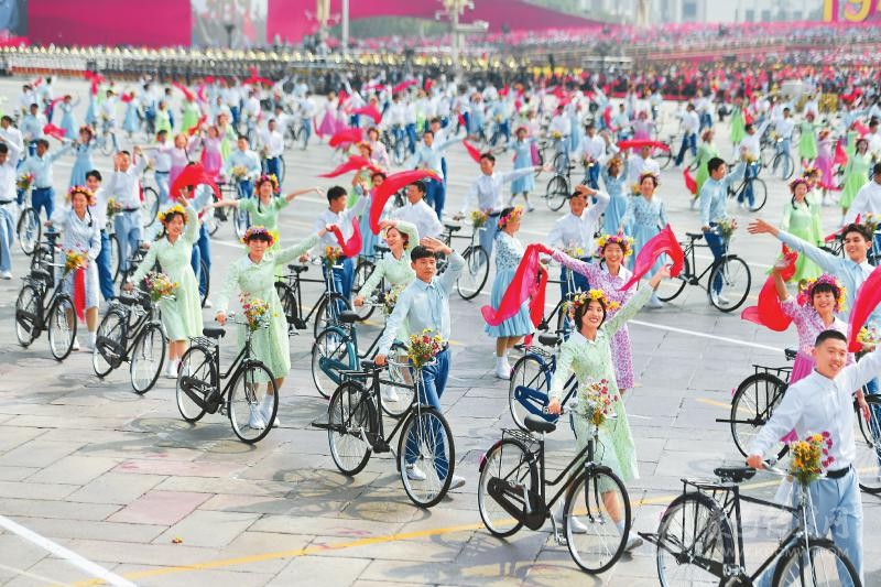 在10月1日上午進(jìn)行的國(guó)慶70周年群眾游行中,上百名少男少女騎著自行車(chē)從廣場(chǎng)通過(guò)。這個(gè)主題為“青春萬(wàn)歲”的場(chǎng)景喚醒了很多人對(duì)20世紀(jì)80年代的時(shí)代記憶……這是本次群眾游行中的第一個(gè)情境式行進(jìn)。