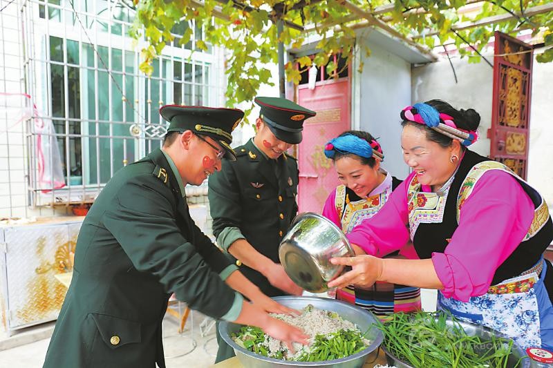 在中國文化中,吃面自古以來就有福壽延綿的美好寓意。圖為10月2日,駐甘孜巴塘官兵與夏邛鎮(zhèn)群眾同吃巴塘冒面,為祖國慶生,祝愿祖國繁榮昌盛、國泰民安。 華西都市報(bào)-封面新聞?dòng)浾?田雪皎 攝
