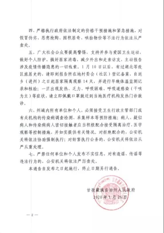 2020年1月24日,我州已全面啟動突發(fā)公共衛(wèi)生事件I級應急響應。根據《中華人民共和國突發(fā)事件應對法》《中華人民共和國傳染病防治法》《突發(fā)公共衛(wèi)生事件應急條例》等法律法規(guī),為確保人民群眾生命安全和身體健康,現(xiàn)就加強我州新型冠狀病毒感染的肺炎聯(lián)防聯(lián)控工作有關事宜通告如下。一、自本通告發(fā)布之日起,全州所有旅游景區(qū)景點、圖書館、文化館、博覽館、電影院、歌舞娛樂場所、洗浴場所、網吧、宗教活動場所等人員密集場所暫停營業(yè)(或對外開放),并暫停涉旅企業(yè)組織的團隊旅游活動。二、疫情防控期間,一律取消或延遲集會展覽、文化體育、集體宗教活動等群眾性聚集活動。禁止任何集體、個人和餐飲服務單位舉辦任何形式的群體性聚會、聚餐活動。如遇婚禮請取消或延遲舉辦;喪事一律從簡并嚴格控制參加人數、落實防控措施。餐飲服務單位、鄉(xiāng)廚和專業(yè)加工團隊不得承辦群體性聚餐宴席(包括農村壩壩宴)。三、關閉活禽交易宰殺市場,禁止在集貿市場銷售、宰殺活禽和從事野生動物捕獵、交易,野生動物飼養(yǎng)繁育場所應當實施隔離措施,禁止餐飲服務單位和個人使用野生動物加工、制售食品。四、嚴格執(zhí)行政府依法制定的價格干預措施和緊急措施,對假冒偽劣、惡意搶購、囤積居奇、哄抬物價等不法行為依法從嚴查處。五、廣大社會公眾要提高警惕,支持并參與愛國衛(wèi)生運動,做好個人防護,搞好居家消毒,減少外出和走親訪友,主動報告涉及疫情傳播隱患的一切線索。1月10日以后,有過湖北等疫區(qū)旅居史的,請即刻報告所在地村委會(社區(qū))登記備案,自返鄉(xiāng)(進州)之日起居家隔離觀察14天,并進行早晚體溫監(jiān)測記錄和核驗;一旦出現(xiàn)發(fā)熱、乏力、呼吸困難、呼吸道感染(干咳為主)等癥狀,請立即佩戴口罩就近到當地醫(yī)療機構發(fā)熱門診就診。六、州域內所有單位和個人,必須接受衛(wèi)生行政主管部門或有關機構的傳染病調查檢測、采集樣本等預防措施;病人、疑似病人和傳染病病人密切接觸者應當積極配合接受隔離治療、醫(yī)學觀察等控制措施,并如實提供有關情況。對拒絕配合的,公安機關將依法協(xié)助強制執(zhí)行;對妨害執(zhí)行公務的,公安機關將依法從嚴從重處理。七、嚴禁任何單位和個人發(fā)布不實信息,對有造謠、傳謠等違法行為的,公安機關將依法嚴厲查處。本通告自發(fā)布之日起施行,終止日期另行通告。