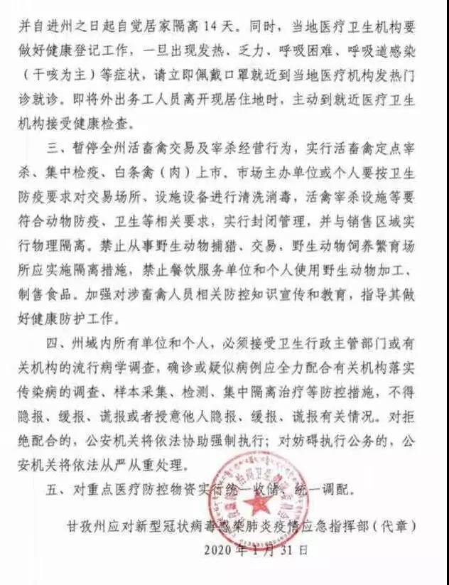 一、暫停各類群體性聚集活動(dòng)。具有交叉感染風(fēng)險(xiǎn)的經(jīng)營單位,如歌舞娛樂、電影院、游戲游藝、洗浴場所、互聯(lián)網(wǎng)上網(wǎng)服務(wù)場所、營業(yè)性麻將場所和兒童游樂設(shè)施、健身房、室內(nèi)游泳場(館)等暫停營業(yè),景區(qū)景點(diǎn)、文化館、圖書館、博覽館、宗教活動(dòng)場所暫停對(duì)外開放,暫停涉旅企業(yè)組織的團(tuán)隊(duì)旅游活動(dòng)。暫時(shí)禁止群體性聚餐(含農(nóng)村自辦群體性宴席)。廣大公眾應(yīng)正確佩戴口罩,自覺將廢棄口罩進(jìn)行毀損并按有害垃圾處置。二、加強(qiáng)村(社區(qū))網(wǎng)格化管理,對(duì)可能的傳染源要找得到、管得住、服務(wù)好。發(fā)熱病人以及來自疫區(qū)人員應(yīng)積極配合村(社區(qū))的排查檢疫工作安排。凡2020年1月10日以來,來自湖北或有過湖北等疫區(qū)旅居史的,請(qǐng)即刻報(bào)告所在村委會(huì)(社區(qū))登記備案,并自進(jìn)州之日起自覺居家隔離14天。同時(shí),當(dāng)?shù)蒯t(yī)療衛(wèi)生機(jī)構(gòu)要做好健康登記工作,一旦出現(xiàn)發(fā)熱、乏力、呼吸困難、呼吸道感染(干咳為主)等癥狀,請(qǐng)立即佩戴口罩就近到當(dāng)?shù)蒯t(yī)療機(jī)構(gòu)發(fā)熱門診就診。即將外出務(wù)工人員離開現(xiàn)居住地時(shí),主動(dòng)到就近醫(yī)療衛(wèi)生機(jī)構(gòu)接受健康檢查。三、暫停全州活畜禽交易及宰殺經(jīng)營行為,實(shí)行活畜禽定點(diǎn)宰殺、集中檢疫、白條禽(肉)上市。市場主辦單位或個(gè)人要按衛(wèi)生防疫要求對(duì)交易場所、設(shè)施設(shè)備進(jìn)行清洗消毒,活禽宰殺設(shè)施等要符合動(dòng)物防疫、衛(wèi)生等相關(guān)要求,實(shí)行封閉管理,并與銷售區(qū)域?qū)嵭形锢砀綦x。禁止從事野生動(dòng)物捕獵、交易,野生動(dòng)物飼養(yǎng)繁育場所應(yīng)實(shí)施隔離措施,禁止餐飲服務(wù)單位和個(gè)人使用野生動(dòng)物加工、制售食品。加強(qiáng)對(duì)涉畜禽人員相關(guān)防控知識(shí)宣傳和教育,指導(dǎo)其做好健康防護(hù)工作。四、州域內(nèi)所有單位和個(gè)人,必須接受衛(wèi)生行政主管部門或有關(guān)機(jī)構(gòu)的流行病學(xué)調(diào)查,確診或疑似病例應(yīng)全力配合有關(guān)機(jī)構(gòu)落實(shí)傳染病的調(diào)查、樣本采集、檢測、集中隔離治療等防控措施,不得隱報(bào)、緩報(bào)、謊報(bào)或者授意他人隱報(bào)、緩報(bào)、謊報(bào)有關(guān)情況。對(duì)拒絕配合的,公安機(jī)關(guān)將依法協(xié)助強(qiáng)制執(zhí)行;對(duì)妨礙執(zhí)行公務(wù)的,公安機(jī)關(guān)將依法從嚴(yán)從重處理。五、對(duì)重點(diǎn)醫(yī)療防控物資實(shí)行統(tǒng)一收儲(chǔ)、統(tǒng)一調(diào)配。甘孜州應(yīng)對(duì)新型冠狀病毒感染肺炎疫情應(yīng)急指揮部