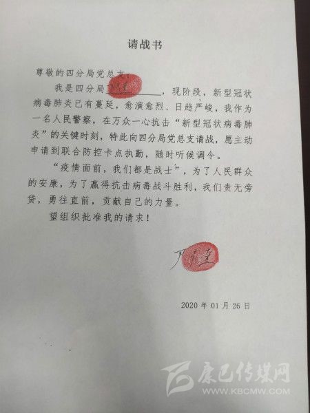 在請戰(zhàn)書上,鮮紅的手印格外醒目。它傳遞出了一名共產黨員、一名人民警察對戰(zhàn)勝這場疫情的堅定決心?!白鳛橐幻伯a黨員,必須第一時間站出來;作為一名人民警察,我們的職責和使命就是守護群眾的生命安全?!币鼜┛f,“大家齊心協(xié)力,一定可以打贏這場硬仗。”