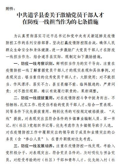 疾風(fēng)知?jiǎng)挪?,板蕩識(shí)誠(chéng)臣。自新型冠狀病毒肺炎疫情防控阻擊戰(zhàn)打響以來(lái),道孚縣各級(jí)黨組織和黨員、干部主動(dòng)擔(dān)當(dāng)作為,積極投入疫情防控最前線,為有力防控疫情蔓延作出重要貢獻(xiàn)。近日,道孚縣委印發(fā)《中共道孚縣委關(guān)于激勵(lì)黨員干部人才在防疫一線擔(dān)當(dāng)作為的七條措施》,關(guān)心關(guān)愛(ài)、激勵(lì)引導(dǎo)廣大黨員、干部、各類(lèi)人才在疫情防控一線履職盡責(zé)、擔(dān)當(dāng)作為、安心戰(zhàn)斗。