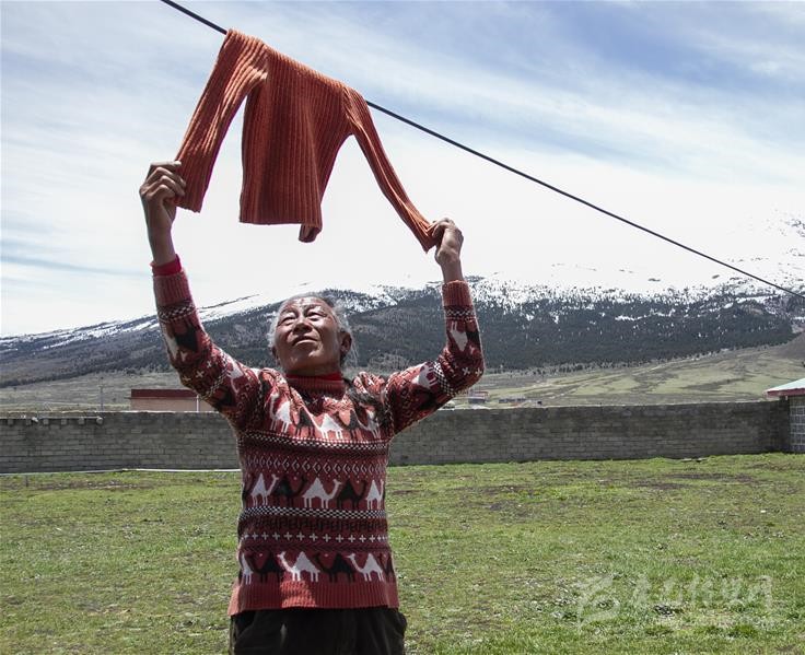 5月30日,四川甘孜藏族自治州理塘縣奔戈鄉(xiāng)卡灰村村民洛登在院里晾曬衣物。新華社記者 李夢(mèng)馨 攝