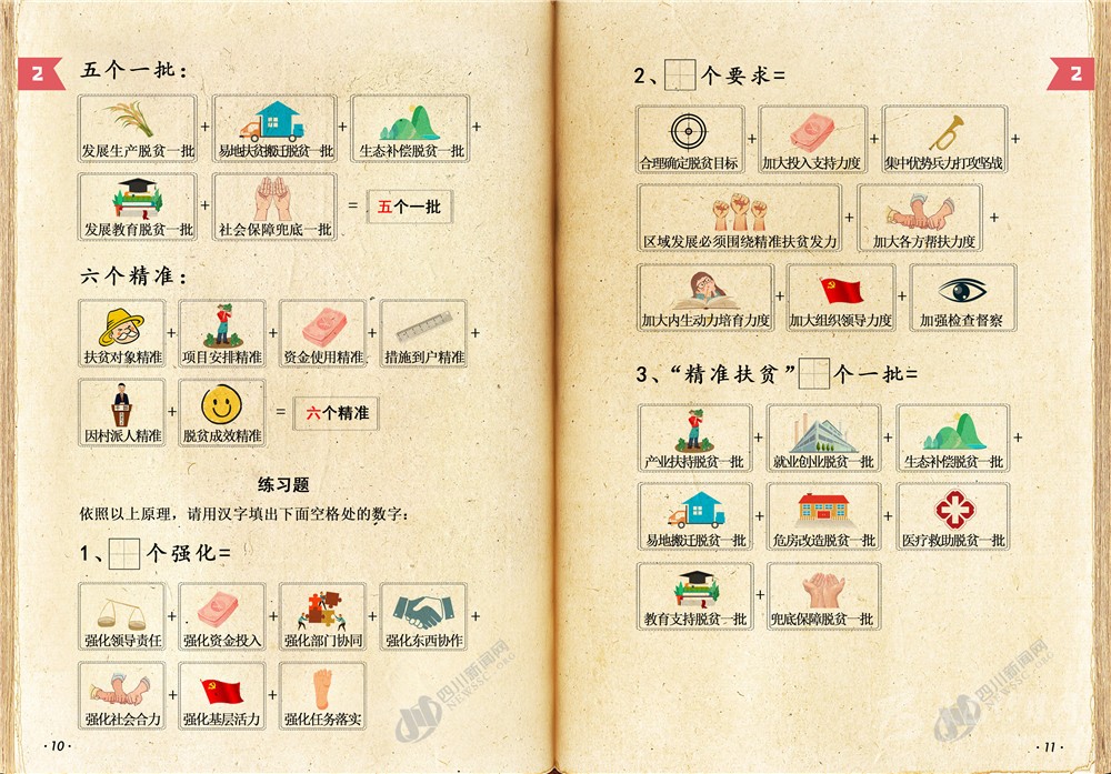 四川新聞網(wǎng)成都8月26日訊 又是周三啦?說好的脫貧攻堅小課堂如期而至!目前,打贏脫貧攻堅戰(zhàn)進入最后沖刺的關(guān)鍵階段,四川還有很多硬仗要打,很多“硬骨頭”要啃,防止返貧致貧任務繁重,脫貧攻堅工作力度還需要加強,面臨的困難和挑戰(zhàn)依然十分艱巨。為了深入推進精準扶貧精準脫貧,奪取全省脫貧攻堅收官之戰(zhàn)全面勝利,本課采用上一課剛剛學到的數(shù)字來總結(jié)歸納了脫貧攻堅政策和方法的關(guān)鍵知識點,以便讓廣大同學進一步掌握這些政策、運用這些方法,提高政策受益覆蓋面及知曉率,確保各項政策落到實處。