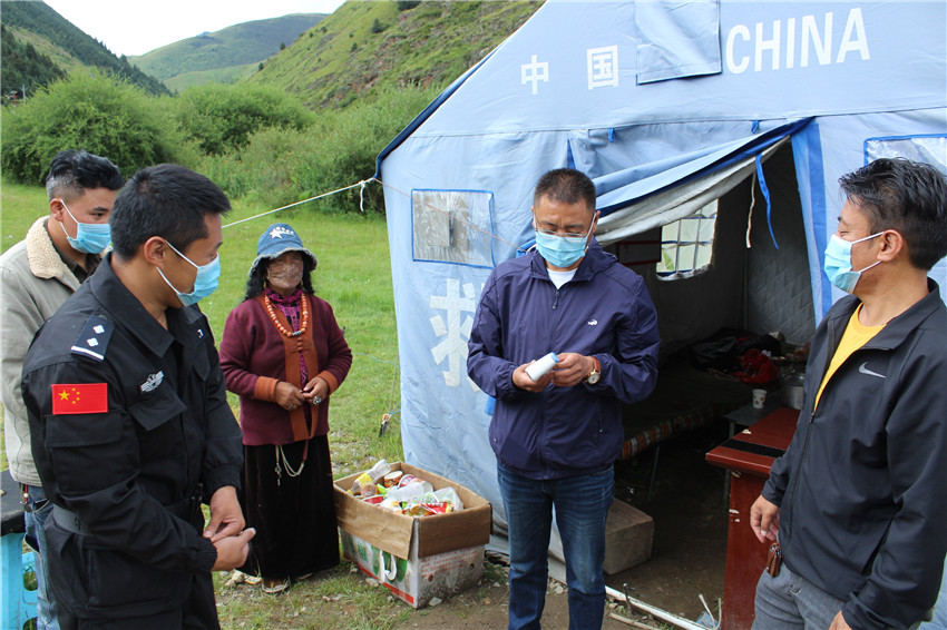 在稻城縣疫苗接種點,工作人員為準備接種人員扎波(中)登記信息。新華社 發(fā)
