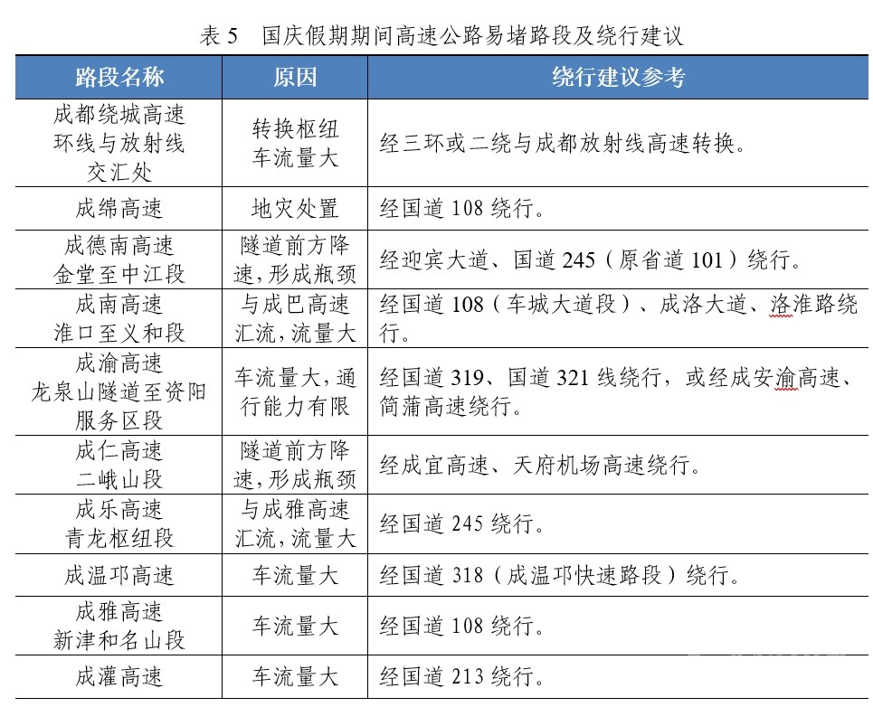成都周邊高速出現(xiàn)擁堵可能性較大。成都繞東高速日均流量約19.02萬輛,遠超設計流量。成溫邛、成都繞西、成雅、成彭、成南高速流量也將大幅提升,日均流量均超過10萬輛。此外,渝蓉、成綿、成灌等方向的路段車流量也較平日車流量增加明顯。