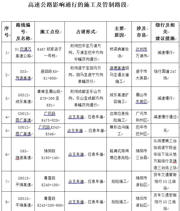 高速公路影響通行的施工及管制路段