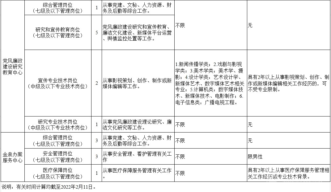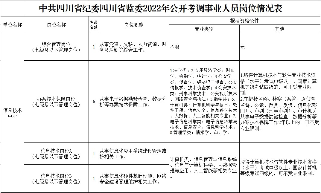 考調(diào)名額 考調(diào)事業(yè)人員25名。其中,信息技術(shù)中心管理崗位9名,黨風(fēng)廉政建設(shè)研究教育中心管理崗位6名、專業(yè)技術(shù)崗位3名,金泉辦案服務(wù)中心管理崗位7名。 考調(diào)對(duì)象及條件 考調(diào)對(duì)象 全省范圍內(nèi)行政單位或參公事業(yè)單位一級(jí)主任科員(含)以下職級(jí)及相當(dāng)職務(wù)層次人員;縣級(jí)及以上公益一類或全額撥款事業(yè)單位管理崗位七級(jí)及以下職員、專業(yè)技術(shù)崗位中級(jí)及以下工作人員。 考調(diào)條件 具有良好的政治素質(zhì)、專業(yè)素養(yǎng),品行端正,實(shí)績(jī)突出,群眾公認(rèn)。 中共黨員。 全日制大學(xué)本科及以上學(xué)歷,并取得相應(yīng)學(xué)士及以上學(xué)位。 年齡35周歲以下(1986年2月11日及以后出生)。 歷年年度考核均為合格(稱職)及以上。 身體心理健康,具有正常履行職責(zé)的身體條件和心理素質(zhì)。 符合報(bào)考崗位規(guī)定的資格條件,詳見《中共四川省紀(jì)委四川省監(jiān)委2022年公開考調(diào)事業(yè)人員崗位情況表》(附后)。 符合法律、法規(guī)規(guī)定的其他條件。 有關(guān)時(shí)間計(jì)算均截至2022年2月11日。 具有下列情形之一的,不得報(bào)考: 被依法列為失信聯(lián)合懲戒對(duì)象的。 涉嫌違紀(jì)違法正在接受有關(guān)專門機(jī)關(guān)審查尚未作出結(jié)論的。 受過黨紀(jì)政務(wù)處分或司法機(jī)關(guān)刑事處罰的。 受到誡勉、組織處理等影響期未滿或期滿影響使用的。 按照有關(guān)規(guī)定,到定向單位工作未滿服務(wù)年限或有其他限制性規(guī)定的。 尚在試用期的。 按照相關(guān)規(guī)定應(yīng)當(dāng)回避的。 法律、法規(guī)規(guī)定的其他情形。 報(bào)名及打印準(zhǔn)考證 2022年2月22日上午8:00至2月26日下午18:00,報(bào)名人員登錄四川省人力資源和社會(huì)保障廳官網(wǎng)(http://rst.sc.gov.cn/)首頁“人事考試”專欄進(jìn)行網(wǎng)上報(bào)名,每人限報(bào)一個(gè)崗位。 對(duì)報(bào)名人員進(jìn)行網(wǎng)上資格初審,通過資格初審者可于2022年3月1日上午8:00至3月2日下午18:00,登陸報(bào)名系統(tǒng)打印筆試準(zhǔn)考證。 考試 考試分筆試和面試。其中,信息技術(shù)崗位A、信息技術(shù)崗位B、宣傳專業(yè)技術(shù)崗位需加試專業(yè)測(cè)試。 根據(jù)筆試情況,擇優(yōu)確定進(jìn)入面試的人選,并適時(shí)開展資格復(fù)審和心理素質(zhì)測(cè)試。資格復(fù)審、心理素質(zhì)測(cè)試、面試時(shí)間和地點(diǎn)另行電話通知。 考察、體檢及試用 考察 根據(jù)考試情況,擇優(yōu)差額確定進(jìn)入考察對(duì)象,深入考察了解人選政治表現(xiàn)、工作能力、廉潔自律和性格特點(diǎn)等。 體檢 根據(jù)考察情況和職位要求,擇優(yōu)等額確定進(jìn)入體檢人選,參照《公務(wù)員錄用體檢通用標(biāo)準(zhǔn)(試行)》進(jìn)行體檢。 頂崗試用 綜合人選考試成績(jī)、考察情況,根據(jù)工作需要和人崗相適原則,擇優(yōu)確定頂崗試用人選。 調(diào)入 試用期滿后,根據(jù)考調(diào)名額和試用期間表現(xiàn),研究確定擬調(diào)人員,經(jīng)公示后按規(guī)定程序辦理調(diào)入手續(xù)。 注意事項(xiàng) 報(bào)考者應(yīng)保證提供真實(shí)、準(zhǔn)確、全面的個(gè)人信息和資料,如有弄虛作假的行為,將按有關(guān)規(guī)定嚴(yán)肅處理。 資格審查貫穿考調(diào)全過程,任一環(huán)節(jié)發(fā)現(xiàn)有不符合考調(diào)條件的,取消考調(diào)資格。 報(bào)名時(shí)請(qǐng)按要求填寫本人手機(jī)號(hào)碼,并保持通訊暢通。未入圍下一環(huán)節(jié)人員,不再另行通知。 進(jìn)入資格復(fù)審者,需由有干部管理權(quán)限的主管部門出具同意考調(diào)的書面意見并加蓋公章。 嚴(yán)明考調(diào)紀(jì)律,報(bào)名者不得托人說情、打招呼,一經(jīng)發(fā)現(xiàn)即取消資格。 遵守疫情防控相關(guān)規(guī)定,服從工作人員安排。 同時(shí),四川省紀(jì)委監(jiān)委還提供相關(guān)咨詢電話:028—62555435;62555354。 (點(diǎn)擊查看大圖)