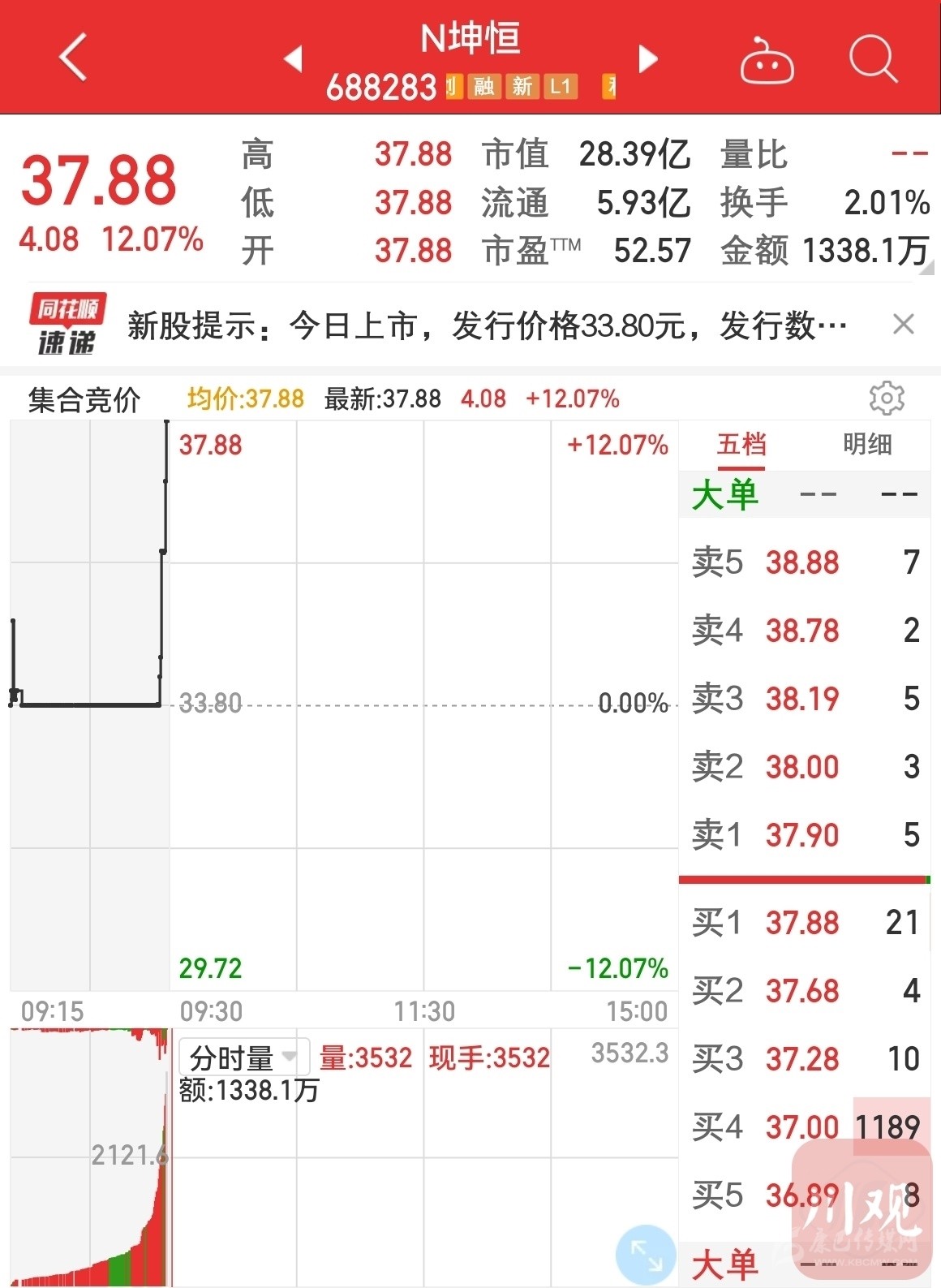 2月15日上午,四川企業(yè)成都坤恒順維科技有限公司在上海證券交易所西部基地敲響上市鑼聲。首日發(fā)行價33.8元,開盤價為37.88元,漲幅12.07%。