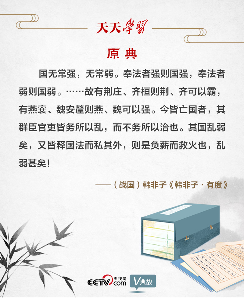 韓非子是戰(zhàn)國(guó)時(shí)期法家思想的集大成者?!坝卸取保褪怯蟹ǘ?。韓非子把“奉法”作為治亂興亡的關(guān)鍵,提出“國(guó)無(wú)常強(qiáng),無(wú)常弱。奉法者強(qiáng)則國(guó)強(qiáng),奉法者弱則國(guó)弱”。意思是,國(guó)家不會(huì)永遠(yuǎn)富強(qiáng),亦不會(huì)長(zhǎng)久貧弱。執(zhí)行法度的人堅(jiān)決,國(guó)家就會(huì)富強(qiáng);執(zhí)行法度的人軟弱,國(guó)家就會(huì)貧弱。
