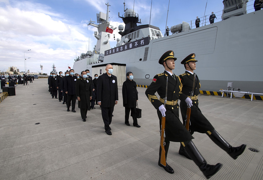 中國人民解放軍海軍揚州艦伏波靜臥,艦上官兵分區(qū)列隊、肅立舷邊。揚州是江澤民同志的故鄉(xiāng)。今天,這艘以揚州命名的軍艦,以最高禮儀送別這位為黨和人民建立了不朽功勛的卓越領導人。江澤民同志的親屬捧護著骨灰登上揚州艦。海軍笛吹響,儀仗隊持槍肅立,行注目禮。當揚州艦起航時,軍港內(nèi)所有艦船汽笛長鳴,響徹云霄。