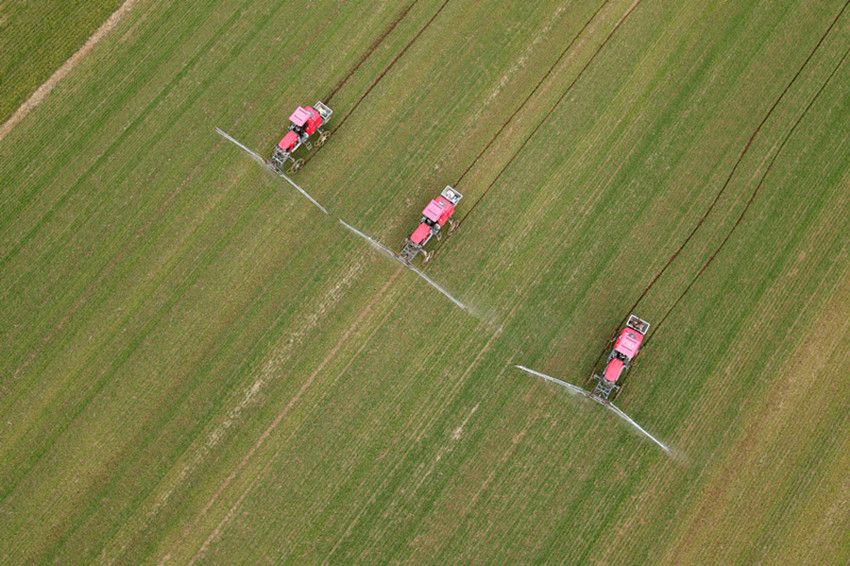 近日,安徽省蚌埠市五河縣頭鋪鎮(zhèn)村民搶抓農(nóng)時進行小麥春管作業(yè),田間地頭一派農(nóng)忙景象。圖為2月14日,在安徽省蚌埠市五河縣頭鋪鎮(zhèn),農(nóng)民駕駛農(nóng)機給小麥噴灑農(nóng)藥(無人機照片)。