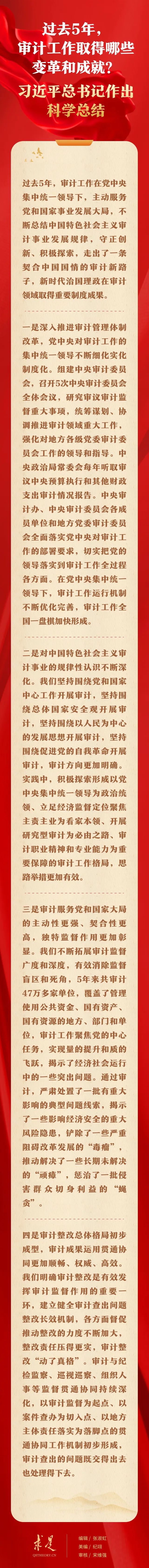 11月1日出版的第21期《求是》雜志刊發(fā)習(xí)近平總書記重要文章《在二十屆中央審計(jì)委員會(huì)第一次會(huì)議上的講話》。在這篇重要文章中,習(xí)近平總書記從4個(gè)方面對過去5年的審計(jì)工作進(jìn)行科學(xué)總結(jié),強(qiáng)調(diào):“審計(jì)工作取得的這些變革和成就,是新時(shí)代中國特色社會(huì)主義思想在審計(jì)領(lǐng)域的具體實(shí)踐,彰顯了黨的創(chuàng)新理論的真理力量,具有鮮明的時(shí)代性和實(shí)踐性。要總結(jié)好、運(yùn)用好黨關(guān)于新時(shí)代審計(jì)工作的理論成果和實(shí)踐成果,長期堅(jiān)持并不斷豐富發(fā)展,指導(dǎo)審計(jì)工作實(shí)現(xiàn)更大作為。”