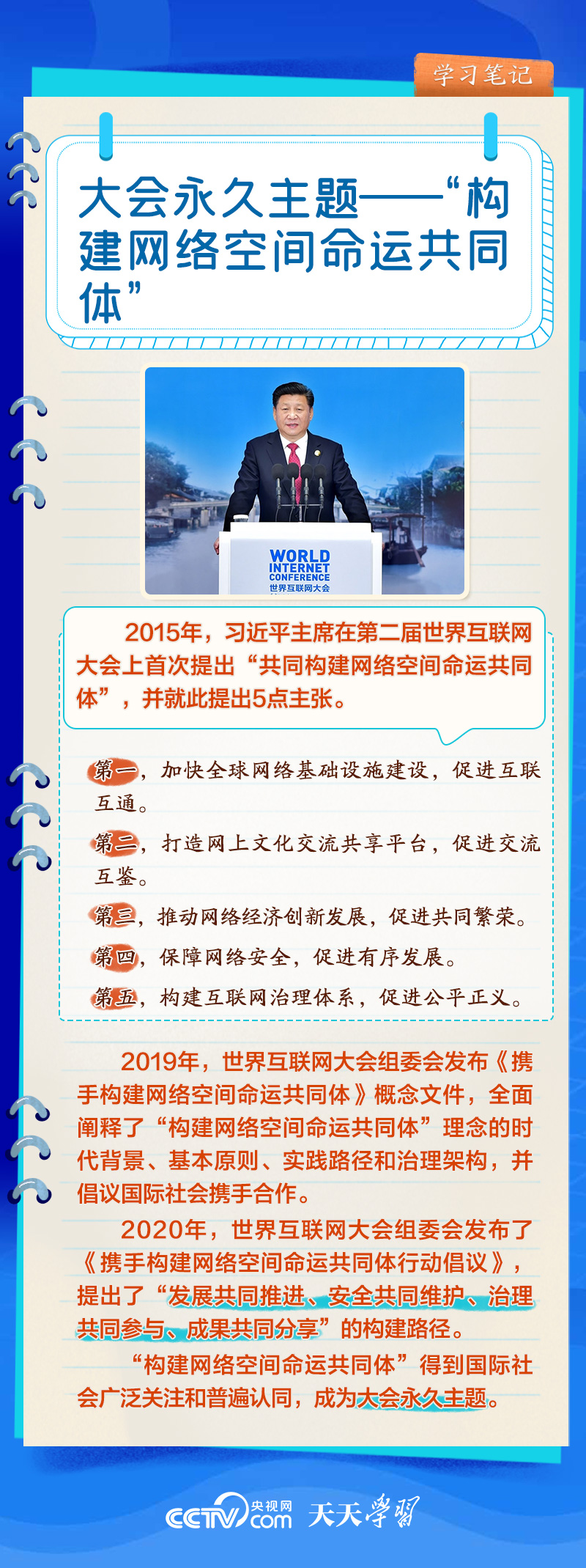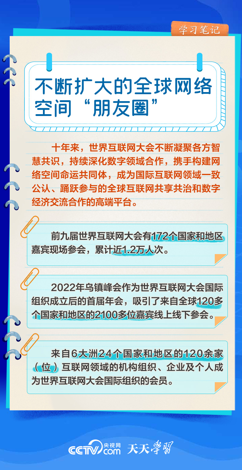 前九屆世界互聯(lián)網(wǎng)大會,習近平主席或親臨現(xiàn)場發(fā)表主旨演講,或視頻致辭,或向大會發(fā)來賀信,以不同形式關(guān)心大會舉辦。央視網(wǎng)《天天學習》欄目推出學習筆記,與您一起了解世界互聯(lián)網(wǎng)大會的十年“網(wǎng)”事。