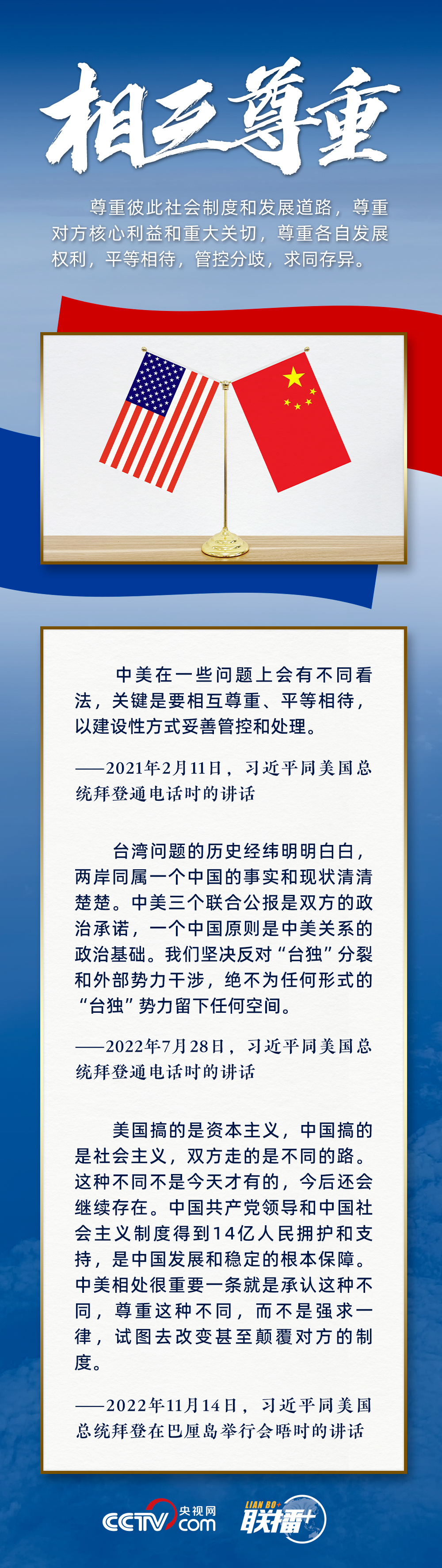 習主席提出新時期中美相處應該堅持的三點原則中,第一個原則就是“相互尊重”。中美歷史和文化差異巨大,在價值觀和社會制度上存在不少分歧。所謂相互尊重,就是要尊重彼此的差異,接受這個世界的多元性。
