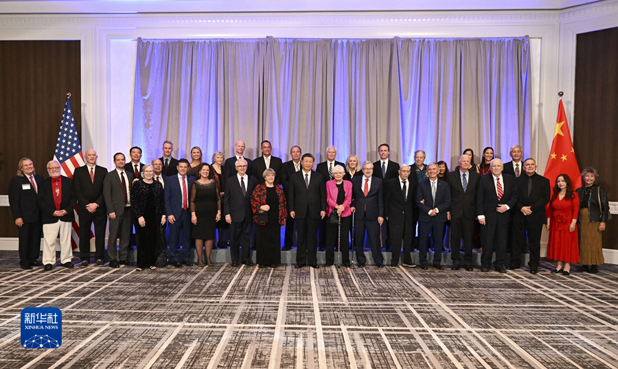 當(dāng)?shù)貢r間11月15日晚,國家主席習(xí)近平在美國舊金山出席美國友好團體聯(lián)合舉行的歡迎宴會。這是宴會開始前,習(xí)近平會見飛虎隊和史迪威將軍后人、鼓嶺、艾奧瓦州、華盛頓州等方面友好人士代表,同他們親切交談并合影留念。新華社記者 謝環(huán)馳 攝 圖片來源:新華網(wǎng)