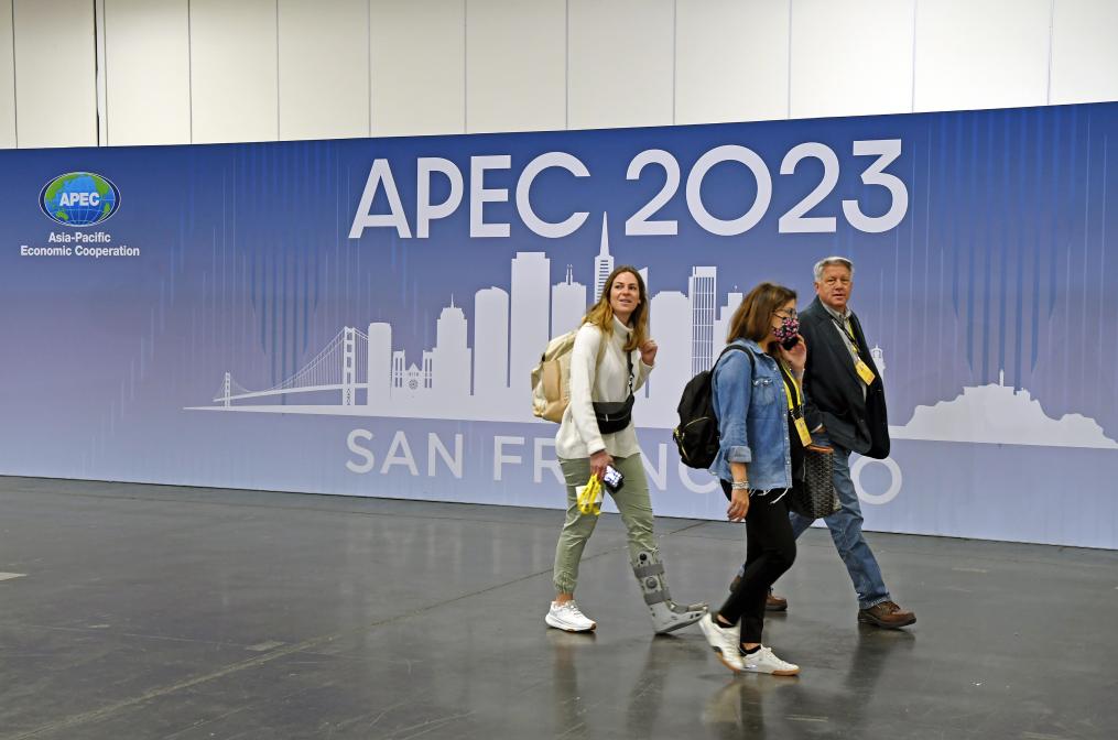 11月12日,在美國舊金山,記者經(jīng)過2023年亞太經(jīng)合組織會議國際媒體中心內的一幅海報。新華社記者李睿 攝