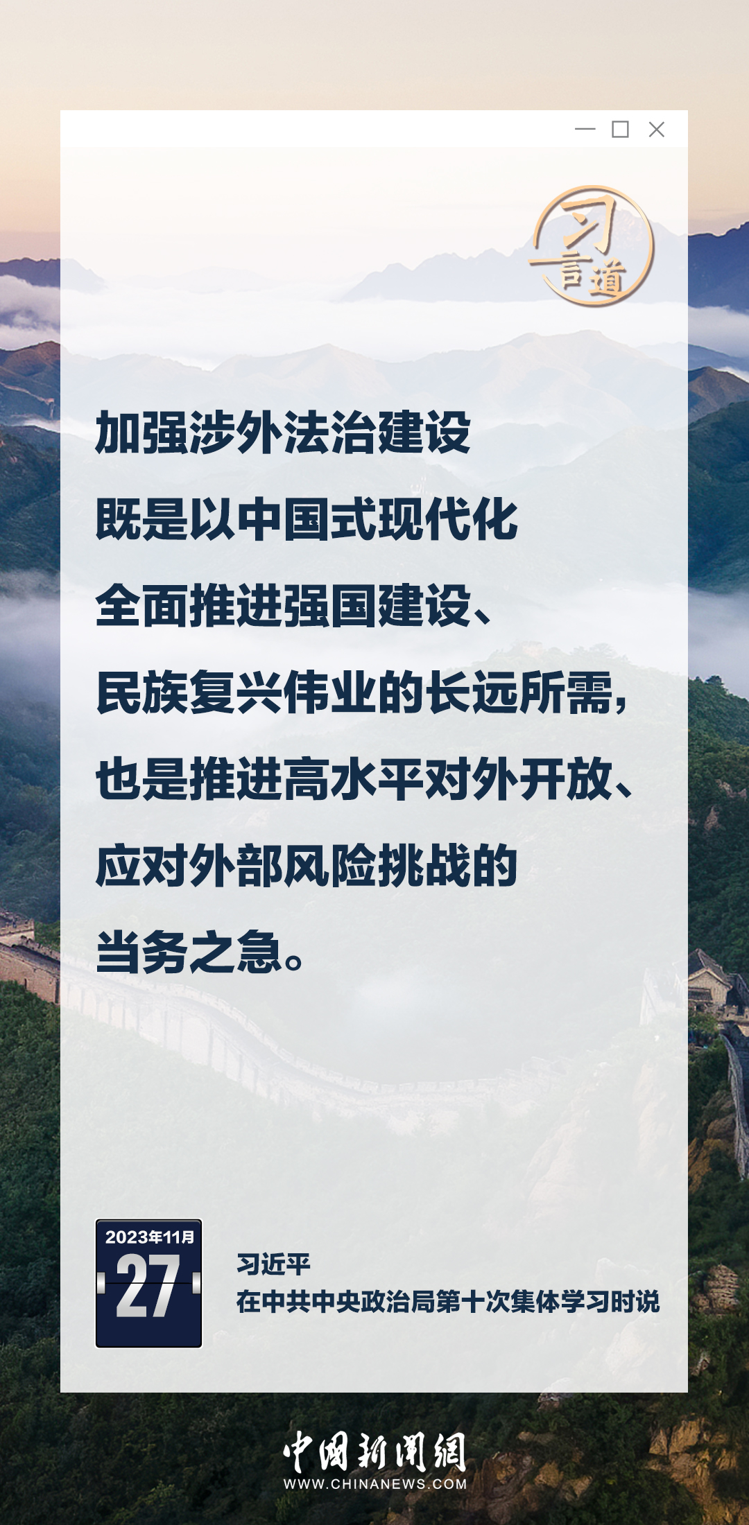 中共中央政治局11月27日下午就加強(qiáng)涉外法制建設(shè)進(jìn)行第十次集體學(xué)習(xí)。中共中央總書記習(xí)近平在主持學(xué)習(xí)時(shí)強(qiáng)調(diào)——