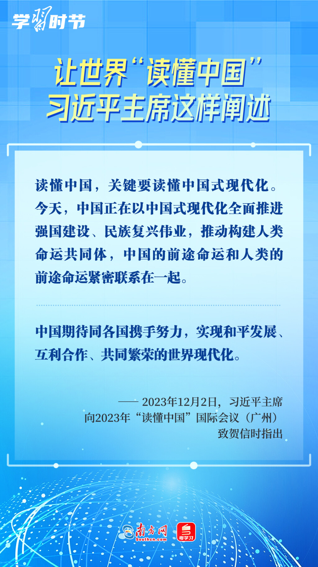 12月2日,2023年“讀懂中國”國際會議在廣州開幕,國家主席習(xí)近平向會議致賀信。習(xí)近平主席在賀信中指出,“讀懂中國,關(guān)鍵要讀懂中國式現(xiàn)代化。”