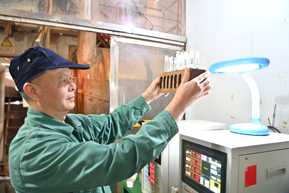 12月12日,廣西來賓小平陽湘桂制糖有限公司的工作人員在檢測(cè)糖漿樣品。