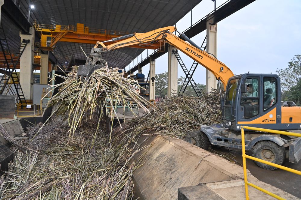 12月14日,在廣西來賓東糖鳳凰有限公司,員工操作機(jī)械將甘蔗投入傳送帶,準(zhǔn)備送往壓榨車間。