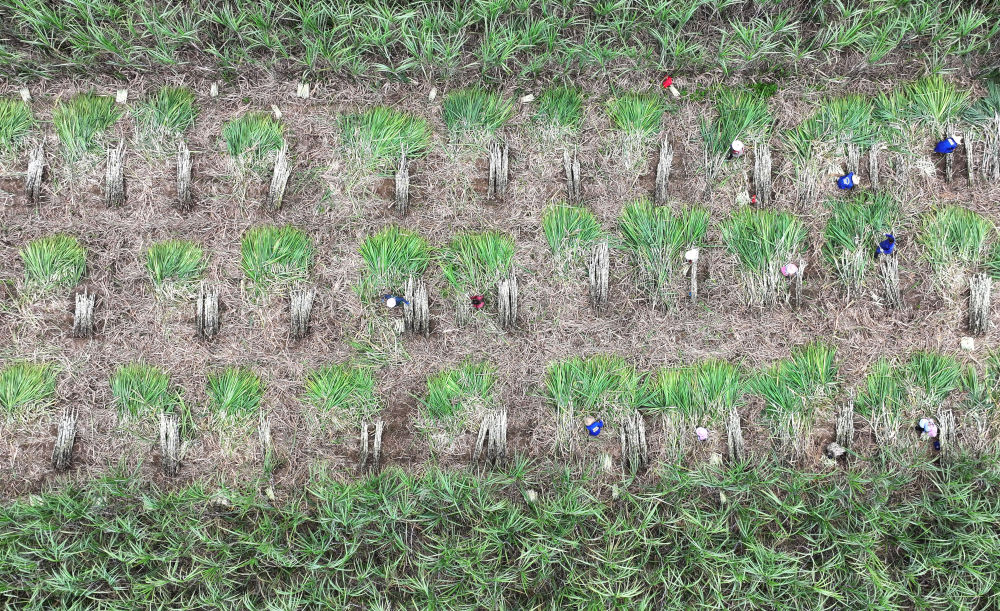 12月12日,在來賓市興賓區(qū)小平陽鎮(zhèn),農(nóng)民在收割甘蔗(無人機(jī)照片)。