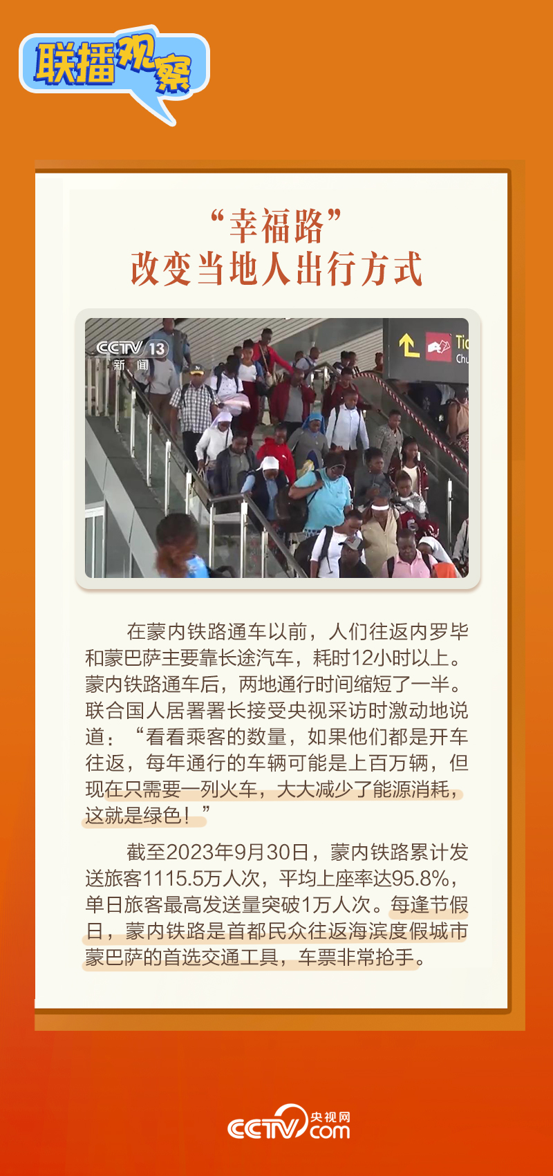 此前,習(xí)主席在外事活動中多次提及蒙內(nèi)鐵路,《新聞聯(lián)播》也持續(xù)關(guān)注這條路的建設(shè)及開通后的運營情況。這條“幸福路”有何特別之處,習(xí)主席為何頻頻提及?它的建成通車給當(dāng)?shù)貛砟男┳兓??《?lián)播觀察》邀您一同了解。