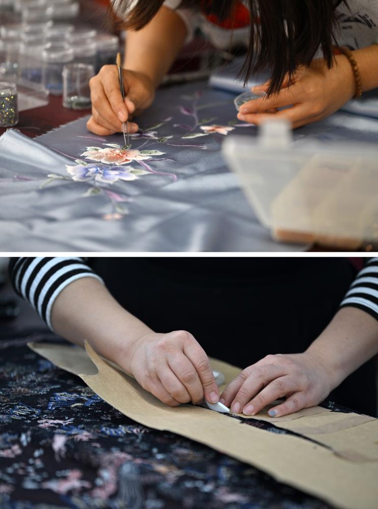 ??拼版照片:上圖為老美華定制車間的制衣師傅在面料上貼鉆;下圖為老美華定制車間的制衣師傅在面料上劃線(2023年12月8日攝)。天津老美華始創(chuàng)于1911年,歷史上以“千層底”布鞋聞名,是享譽(yù)津門(mén)的“中華老字號(hào)”。新華社記者 李然 攝