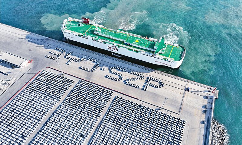 2023年,我國電動載人汽車、鋰離子蓄電池和太陽能電池為代表的“新三樣”產(chǎn)品合計出口首次突破萬億元大關,展現(xiàn)了中國制造的新優(yōu)勢。圖為2024年1月14日,比亞迪“開拓者1號”(“BYD EXPLORER NO.1”)滾裝船抵達深圳港小漠國際物流港。 新華社發(fā)