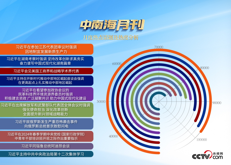 央視網(wǎng)“智聞”系統(tǒng)提取分析2024年3月全網(wǎng)時政新聞熱點顯示,“習(xí)近平總書記在湖南考察”“新時代推動中部地區(qū)崛起座談會”等相關(guān)話題備受關(guān)注。