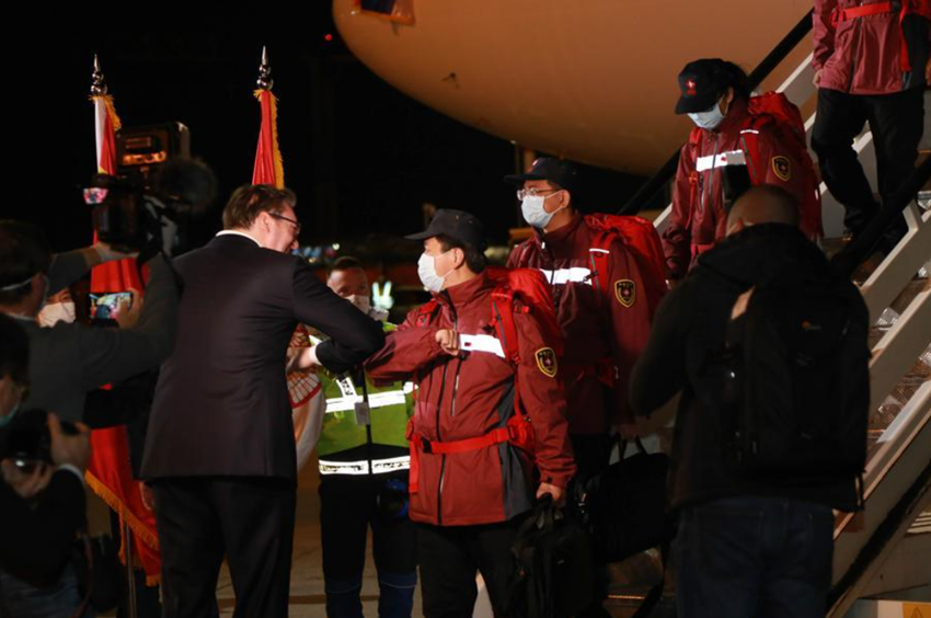 中國(guó)醫(yī)療團(tuán)隊(duì)在貝爾格萊德尼古拉·特斯拉機(jī)場(chǎng)降落時(shí)已是深夜。武契奇率領(lǐng)塞方多名高級(jí)官員到機(jī)場(chǎng)迎接。疫情期間不建議握手,于是這位塞爾維亞領(lǐng)導(dǎo)人選擇和中國(guó)專家團(tuán)成員一一碰肘以示尊重。對(duì)中國(guó)的及時(shí)支援心懷感激,他還在機(jī)場(chǎng)親吻了一面五星紅旗。