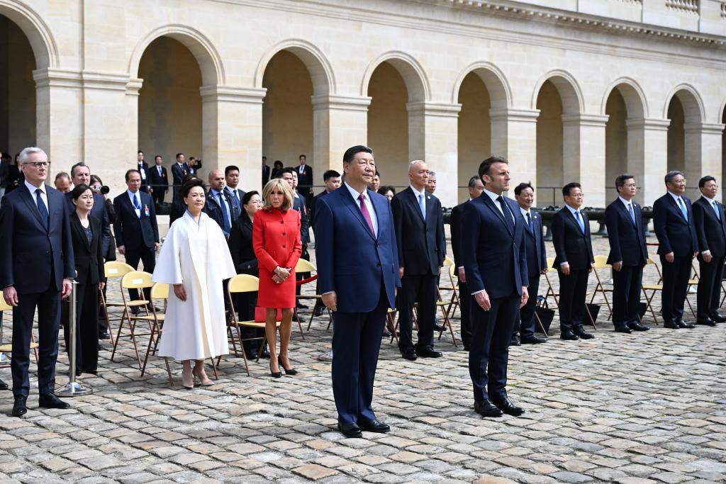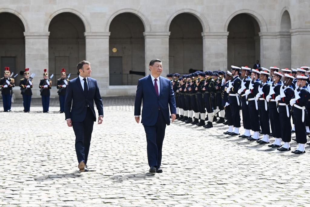 ??當(dāng)天下午,習(xí)近平在巴黎出席馬克龍舉行的隆重盛大歡迎儀式。兩國元首檢閱法蘭西共和國衛(wèi)隊(duì)和陸海空三軍儀仗隊(duì),并觀看分列式。