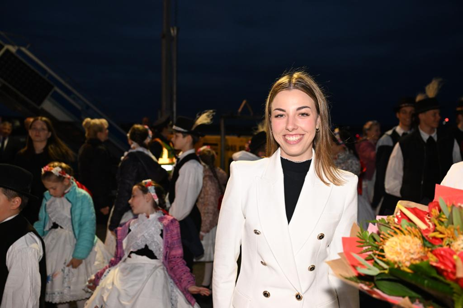 ??當(dāng)?shù)貢r(shí)間5月8日晚,在匈牙利布達(dá)佩斯國(guó)際機(jī)場(chǎng)歡迎隊(duì)伍中的匈牙利姑娘歐拉·塔瑪拉。新華社記者 謝環(huán)馳 攝