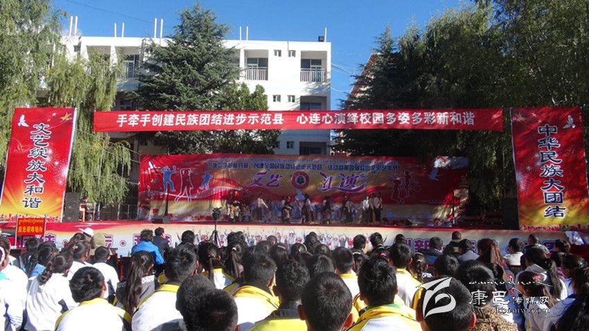 “手牽手創(chuàng)建民族團結(jié)進步示范縣·心連心演繹校園多姿多彩新和諧”被確定為本次活動的主題。輕快的音樂,靈動的舞步,具有濃郁藏民族特色的《炫舞鍋莊》拉開文藝表演的帷幕。表演者穿戴藏族服飾載歌載舞,盡情表演,瞬時將氣氛推向了高潮。文藝表演以學(xué)生的班級和教師的教研組為單位,將各自班級或教研特色融入到表演中,特別是一曲《做不到》,兩名男女中學(xué)生將學(xué)生時期的叛逆思想和對未來美好生活的向往展現(xiàn)得淋漓盡致。大合唱《我相信》,盡現(xiàn)了全班同學(xué)的團隊精神。同學(xué)們個個精神抖擻、氣勢如虹,唱出了對未來的無限希翼。表演持續(xù)2個多小時,教師和學(xué)生們將他們精心編排、傾情演繹的一個個精彩節(jié)目呈現(xiàn)給現(xiàn)場觀眾。
