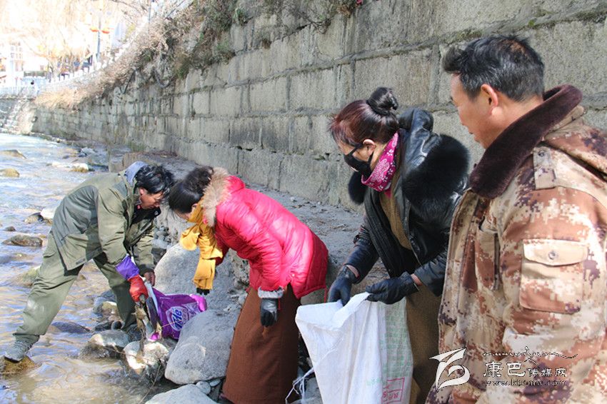 冬季的折多河水流量少,河水較淺,河道邊有許多地方都裸露出來。記者看見,有兩男兩女腳穿水靴踩在河邊正在撿拾樹枝、菜葉、白色塑料袋等雜物,其中一個男子雙手都攥滿了爛菜葉,其余三個人手里也都拎著一個滿滿的編織袋。記者上前和那名手攥爛菜葉的男子進行交談,得知他們并不是拾荒者,而是康定市市政管理局專門負責清理河道衛(wèi)生的清潔工。