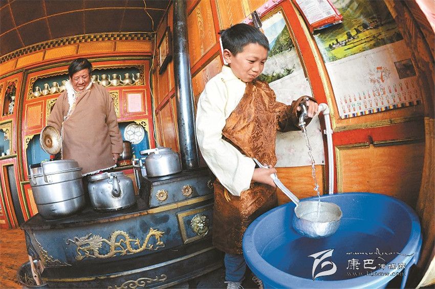 被稱(chēng)為世界高城的理塘縣,“吃水難”過(guò)去一直是當(dāng)?shù)厝罕娚铍y題。2012年實(shí)施對(duì)口援建以來(lái),樂(lè)山市和理塘縣把此項(xiàng)工作列為 “一號(hào)民生工程”來(lái)抓。2013年,樂(lè)山市和理塘縣在位于海拔5000米的理塘縣奔戈鄉(xiāng)境內(nèi)的索絨山上開(kāi)建奪曲河水庫(kù),2014年7月奪曲河水庫(kù)全部竣工,2015年10月,理塘縣首批2200戶(hù)自來(lái)水實(shí)現(xiàn)入戶(hù),到今年底縣城中心城區(qū)將全部實(shí)現(xiàn)自來(lái)水入戶(hù)供水。圖為扎吉和家人正歡喜地接水準(zhǔn)備做飯。