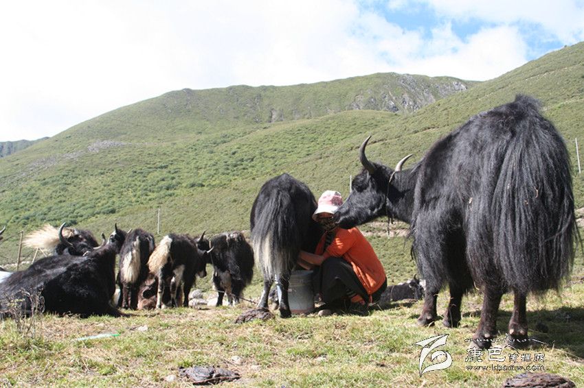 牧民正在擠牦牛奶。
