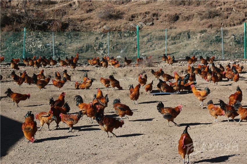 雄雞啼鳴鬧山谷,灣地溝村喜脫貧。12月9日上午10時許,當(dāng)記者沿著通村水泥路來到距雅江縣城20多公里的呷拉鎮(zhèn)灣地溝村紅標(biāo)雞生態(tài)養(yǎng)殖基地時,只見冬日暖陽下的洼谷山半山坡上,成群結(jié)隊的大紅公雞正在樹林下或覓食或展翅或歡歌。飼養(yǎng)員告訴記者:“別小看這3000多只活潑可愛的跑山雞,那可是村民心中的‘財富金雞’!”