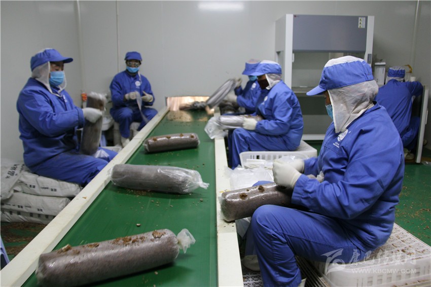 穿上防護(hù)服、經(jīng)過藥水消毒和空氣消毒后,記者進(jìn)入菌種培育室,菌棒通過傳送帶源源不斷地傳輸,工人們眼明手快地在菌棒孔里種植菌種。